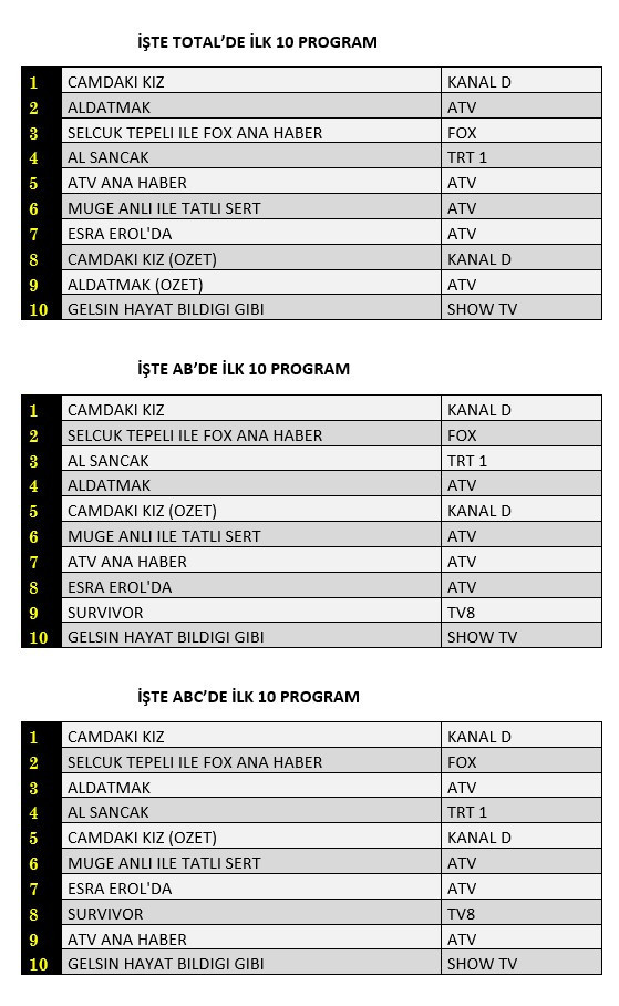 AB'de ise 1.sırada “Camdaki Kız”, 2.sırada “Selçuk Tepeli İle Fox Ana Haber”, 3.sırada TRT1’de yayınlanan “Al Sancak” yer aldı.