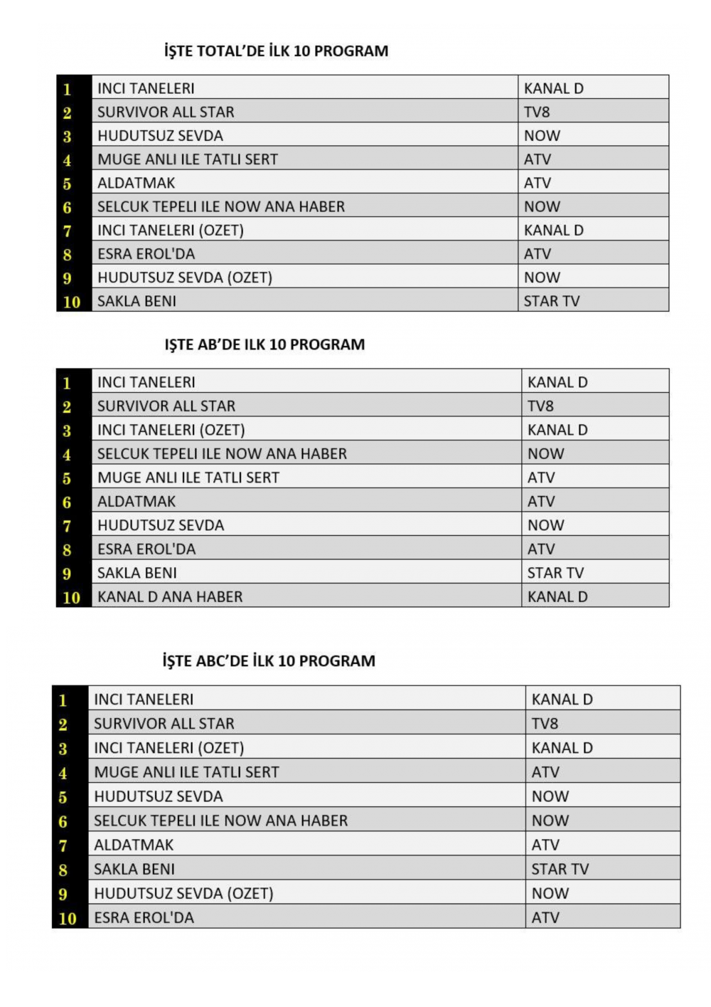 ABC'de ise 1.sırada “İnci Taneleri”, 2.sırada “Survivor All Star”, 3.sırada “İnci Taneleri” dizisinin özeti yer aldı.
