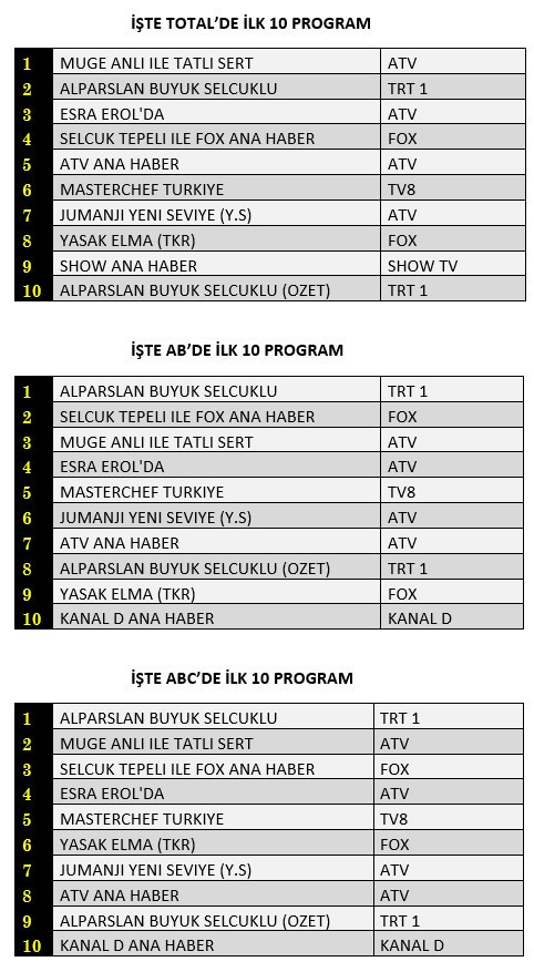 AB'de ise 1. sırada “Alparslan Büyük Selçuklu”, 2. sırada yine “Selçuk Tepeli İle Fox Ana Haber”, 3. sırada “Müge Anlı İle Tatlı Sert” yer aldı.