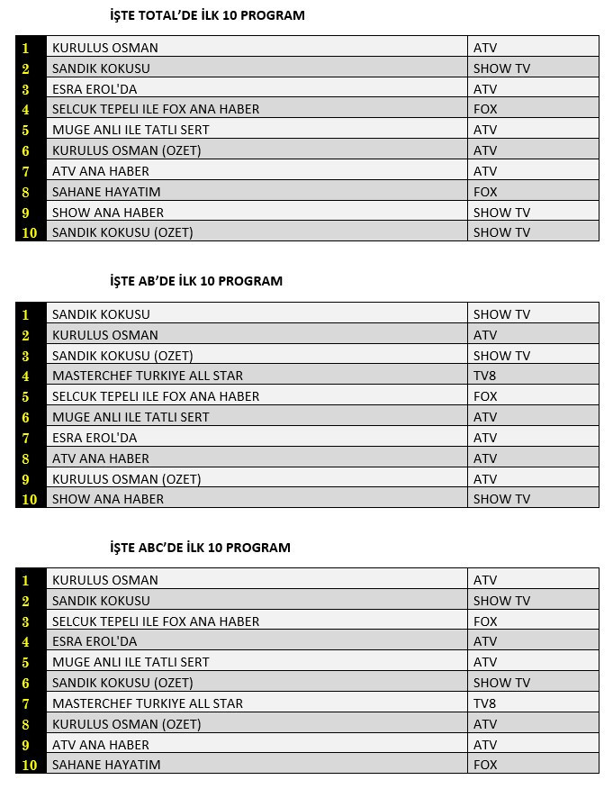 Total'de 1. sırada Atv’de izleyiciyle buluşan “Kuruluş Osman”, 2. sırada Show TV’de yayınlanan “Sandık Kokusu”, 3. sırada Atv’de ekrana gelen “Esra Erol’da” yer aldı.