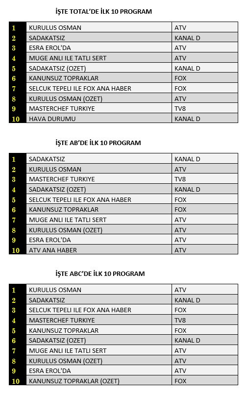 Total'de 1. sırada ATV’de yayınlanan “Kuruluş Osman” 2. sırada Kanal D’de izleyiciyle buluşan “Sadakatsiz”, 3. sırada ATV’de ekrana gelen “Esra Erol’da” yer aldı.