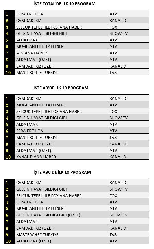 AB'de ise 1. sırada “Camdaki Kız”, 2. sırada Atv’de yayınlanan “Müge Anlı İle Tatlı Sert” 3. sırada “Selçuk Tepeli İle Fox Ana Haber” yer aldı.