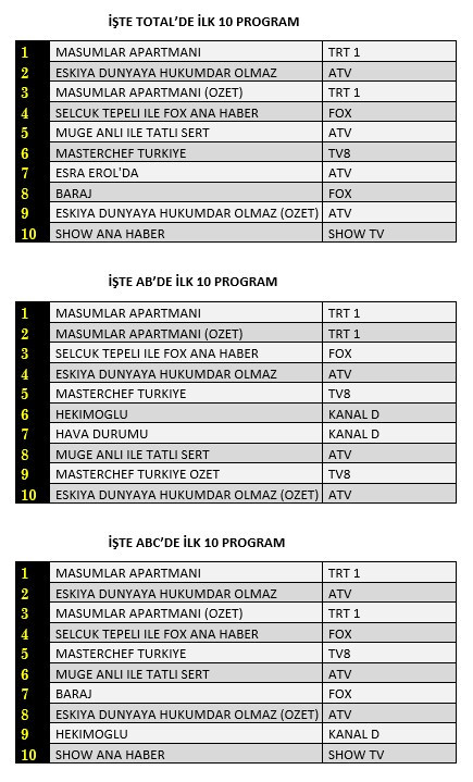 Total'de 1. sırada TRT1’de yayınlanan “Masumlar Apartmanı”, 2. sırada ATV’de ekrana gelen “Eşkıya Dünyaya Hükümdar Olmaz”, 3. sırada “Masumlar Apartmanı”nın özeti yer aldı.