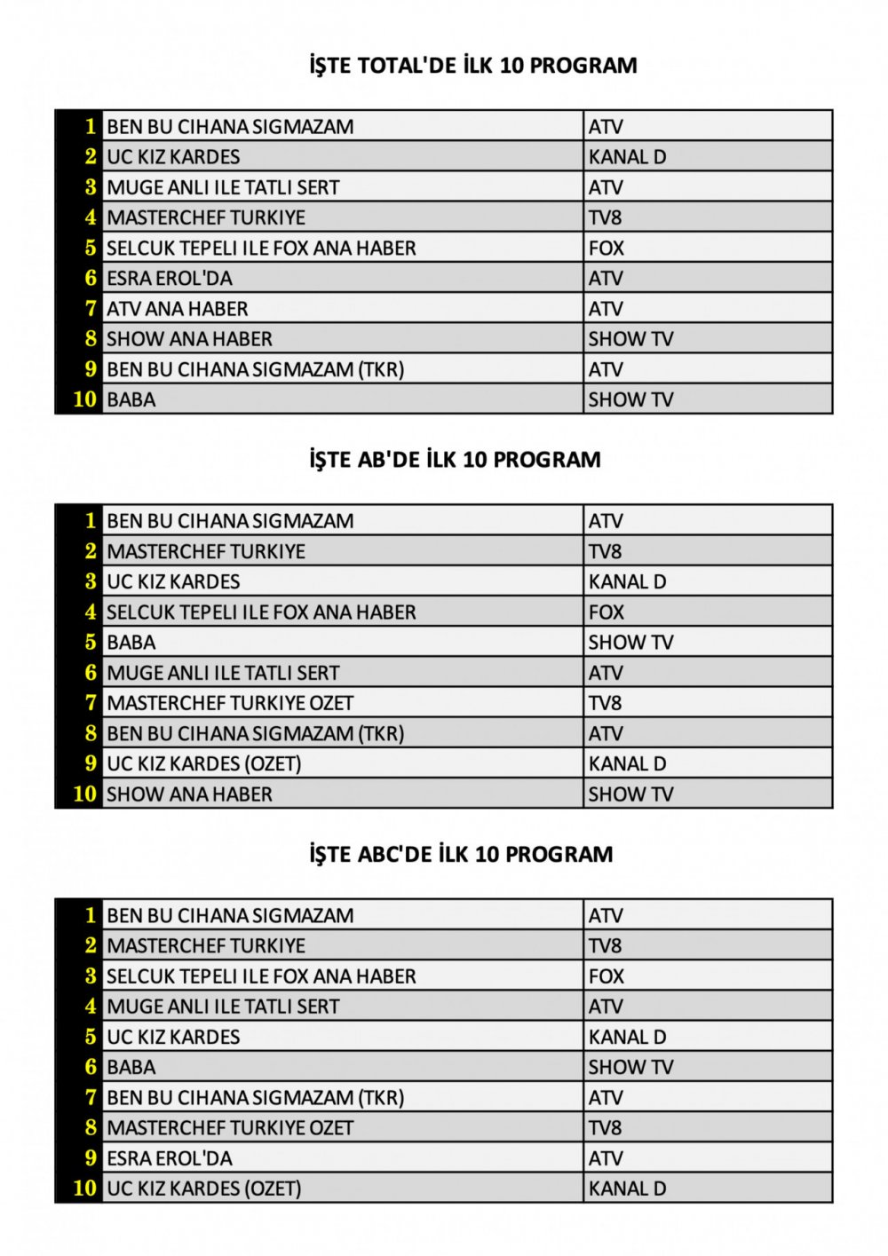 AB’de 1. sırada “Ben Bu Cihana Sığmazam”, 2. sırada “MasterChef Türkiye”, 3. sırada ise “Üç Kız Kardeş” yer aldı.
