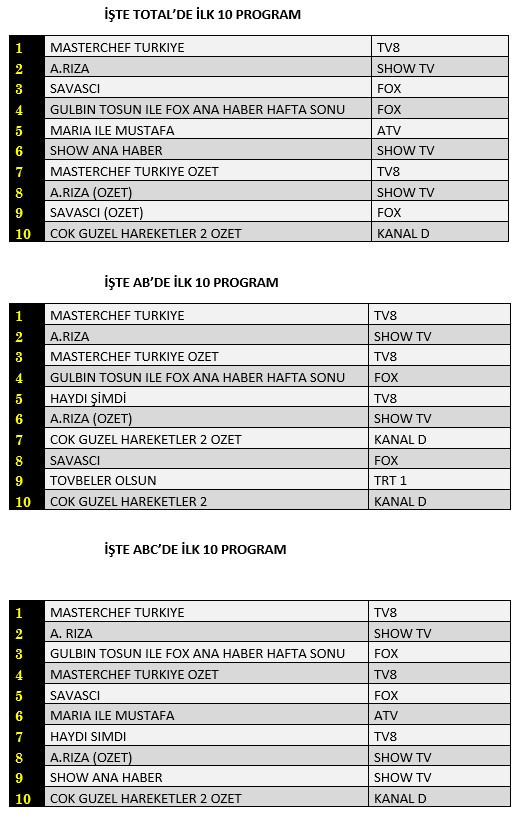 AB'de ise 1. sırada “Mastercheff Türkiye”, 2. sırada “A.Rıza”, 3. sırada “Mastercheff Türkiye”in özeti yer aldı.