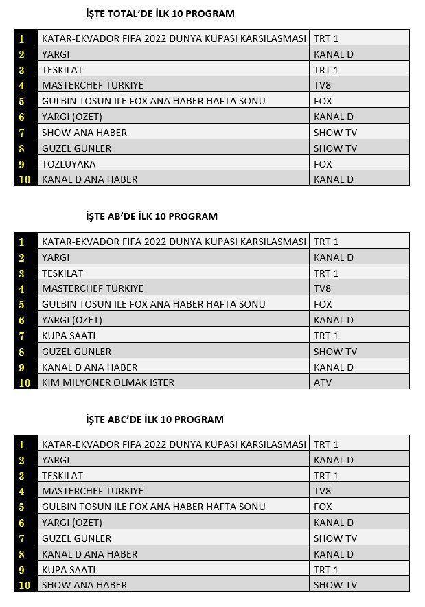 Total'de 1. sırada TRT1’de izleyiciyle buluşan “Katar-Ekvador FİFA 2022 Dünya Kupası Karşılaşması”, 2. sırada Kanal D’de ekrana gelen “Yargı”, 3. sırada TRT1’de yayınlanan “Teşkilat” yer aldı.