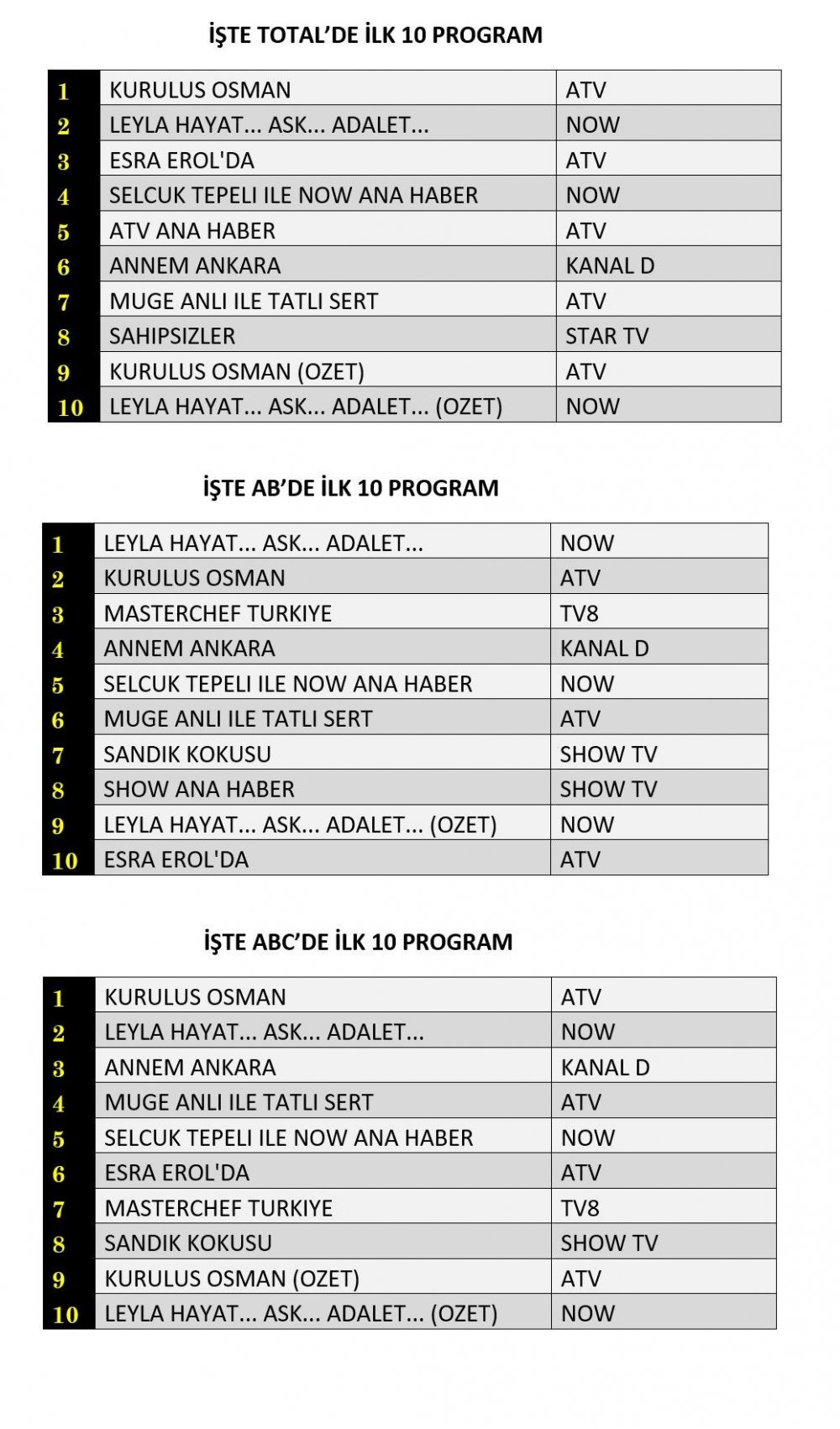 Total kategorisinde birinci sırada atv'de yer alan Kuruluş Osman, ikinci sırada NOW'da yayınlanan Leyla Hayat… Aşk… Adalet…dizisi, üçüncü sırada ise atv'de yayınlanan Esra Erol yer aldı.