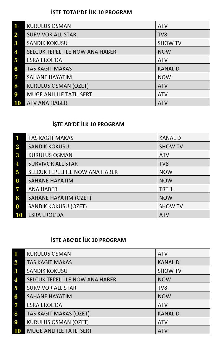 Total'de 1.sırada “Kuruluş Osman”, 2. sırada “Survivor All Star”, 3.sırada “Sandık Kokusu” yer aldı.