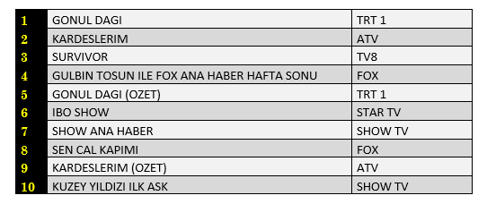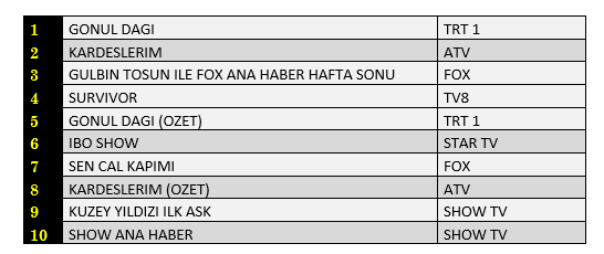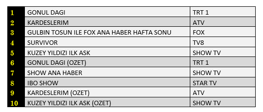 Total'de 1.sırada TRT1’de ekrana gelen“Gönül Dağı”, 2. Sırada ATV’de yayınlanan “Kardeşlerim”, 3.sırada "Gülbin Tosun ile Fox Ana Haber Hafta Sonu" yer aldı.