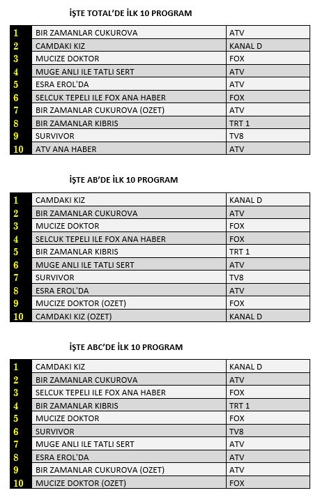 Total'de 1. sırada ATV’de ekrana gelen “Bir Zamanlar Çukurova”, 2. sırada Kanal D’de yayınlanan “Camdaki Kız”, 3. sırada FOX TV’de izleyiciyle buluşan “Mucize Doktor” yer aldı.