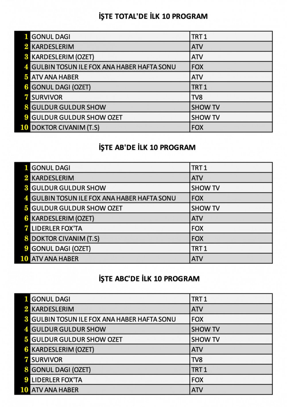 AB’de 1. sırada “Gönül Dağı”, 2. sırada “Kardeşlerim”, 3. sırada ise “Güldür Güldür Show” yer aldı.