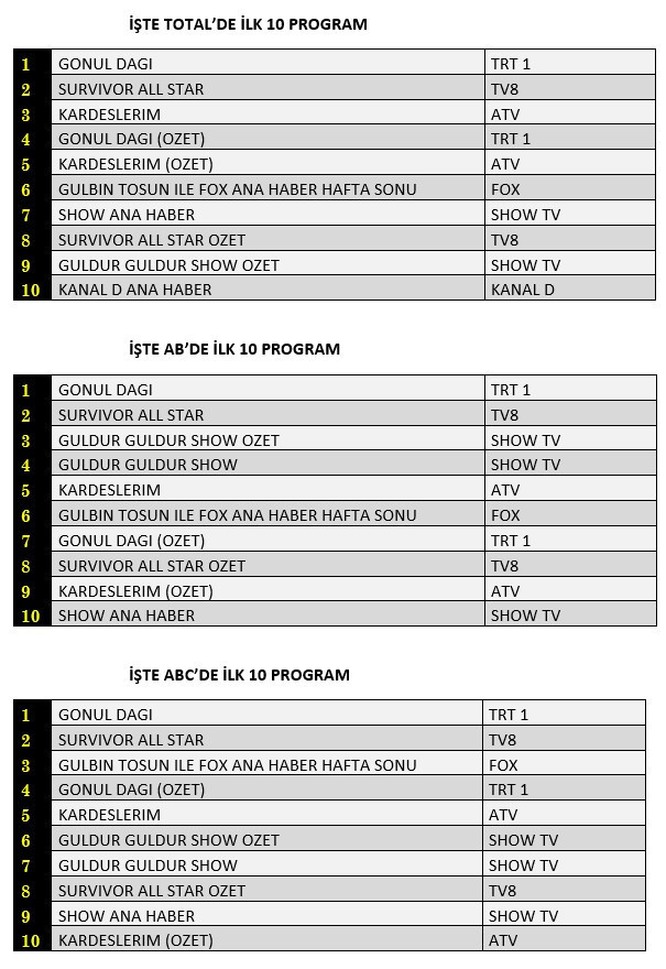 AB'de ise 1.sırada “Gönül Dağı”, 2.sırada “Survivor All Star”, 3.sırada Show TV’de yayınlanan “Güldür Güldür Show”un özeti yer aldı.