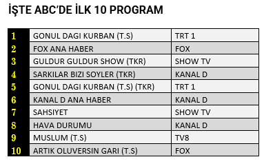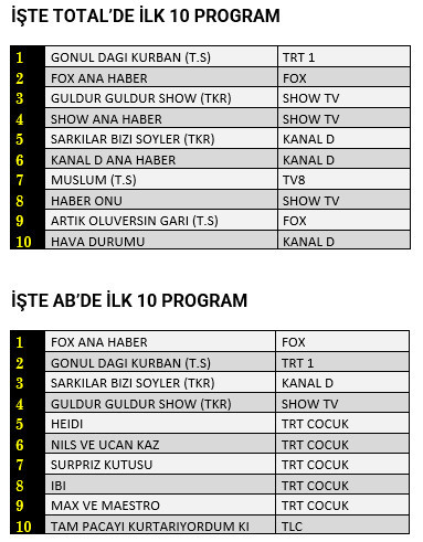 AB'de ise 1.sırada “Fox Ana Haber”, 2.sırada “Gönül Dağı Kurban” 3.sırada Kanal D’de yayınlanan “Şarkılar Bizi Söyler” programının tekrarı yer aldı.