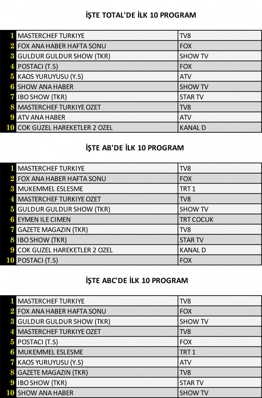 Total’de 1. sırada TV8’de izleyici ile buluşan “MasterChef Türkiye”, 2. sırada “FOX Ana Haber Hafta Sonu”, 3. sırada ise Show TV’de yayınlanan “Güldür Güldür Show” tekrar bölümü yer aldı.