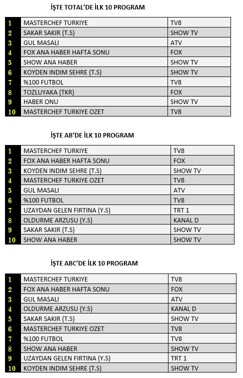 AB'de ise 1. sırada “Masterchef Türkiye”, 2. sırada “Fox Ana Haber Hafta Sonu” 3. sırada Show TV yayınlanan Türk Sineması “Köyden İndim Şehre” yer aldı.