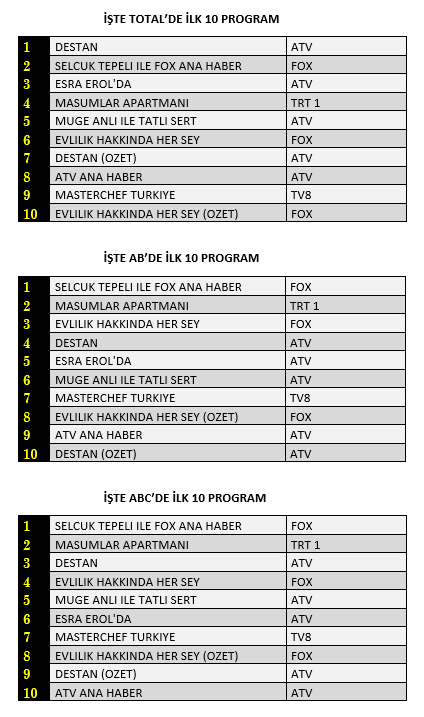 AB'de ise 1. sırada “Selçuk Tepeli İle Fox Ana Haber”, 2. sırada TRT1’de yayınlanan “Masumlar Apartmanı” 3. sırada Fox TV’de ekrana gelen “Evlilik Hakkında Her Şey” yer aldı.
