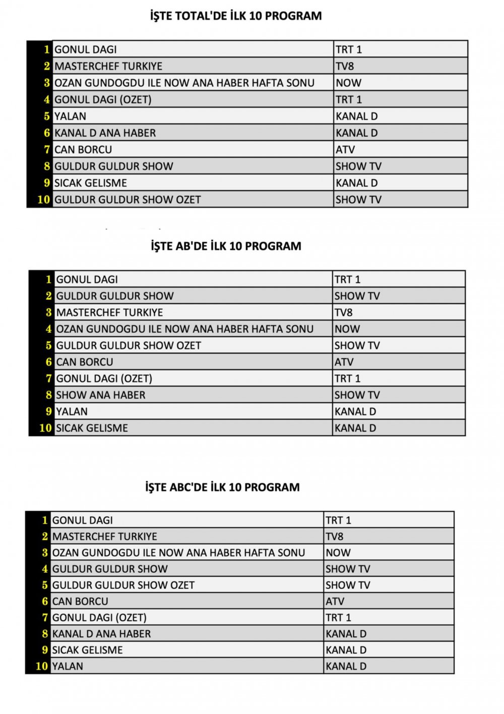 Total’de 1. sırada TRT 1’de izleyici ile buluşan “Gönül Dağı” yer aldı.Total’de 2. sırada tv8’de ekranlara gelen “MasterChef Türkiye” yer aldı.Total 3. sırada ise “Ozan Gündoğdu ile NOW Ana Haber Hafta Sonu” yer aldı.