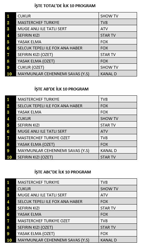 AB'de ise 1. sırada “Mastercheff Türkiye”, 2. sırada “Selçuk Tepeli İle Fox Ana Haber”, 3. sırada FOX TV’de yayınlanan “Yasak Elma” yer aldı.