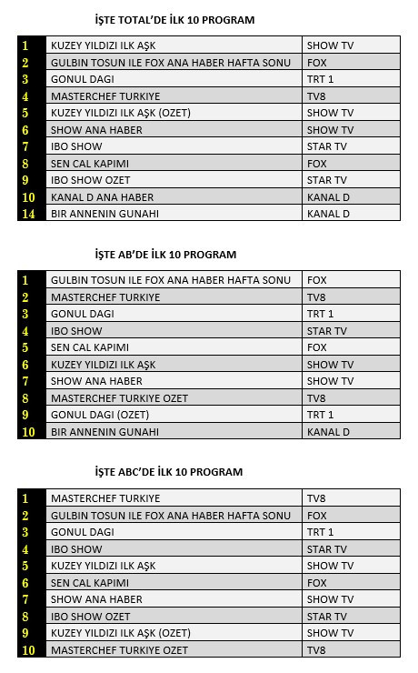 AB'de ise 1. sırada “Gülbin Tosun İle Fox Ana Haber Hafta Sonu”, 2. sırada TV8’de yayınlanan “Masterchef Türkiye”, 3. sırada “Gönül Dağı” yer aldı.