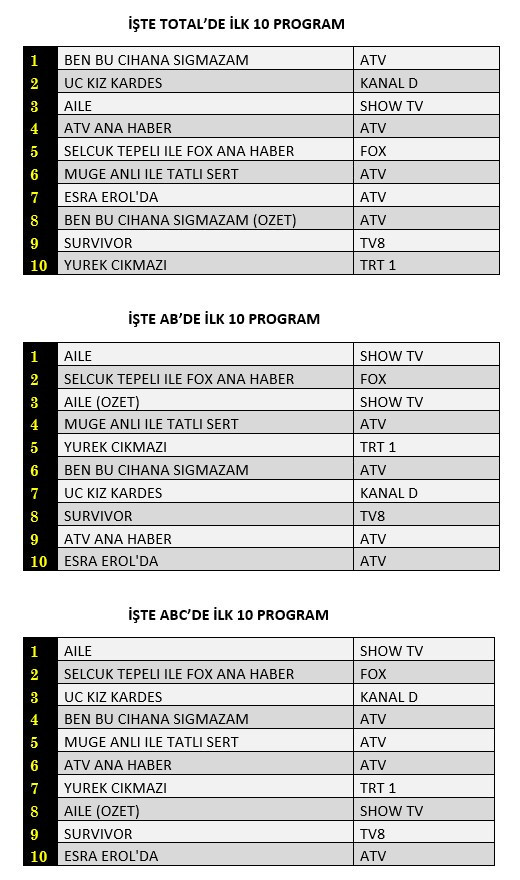 Total'de 1. sırada Atv’de izleyiciyle buluşan “Ben Bu Cihana Sığmazam”, 2. sırada Kanal D’de ekrana gelen “Üç Kız Kardeş”, 3. sırada Show TV’de yayınlanan “Aile” yer aldı.