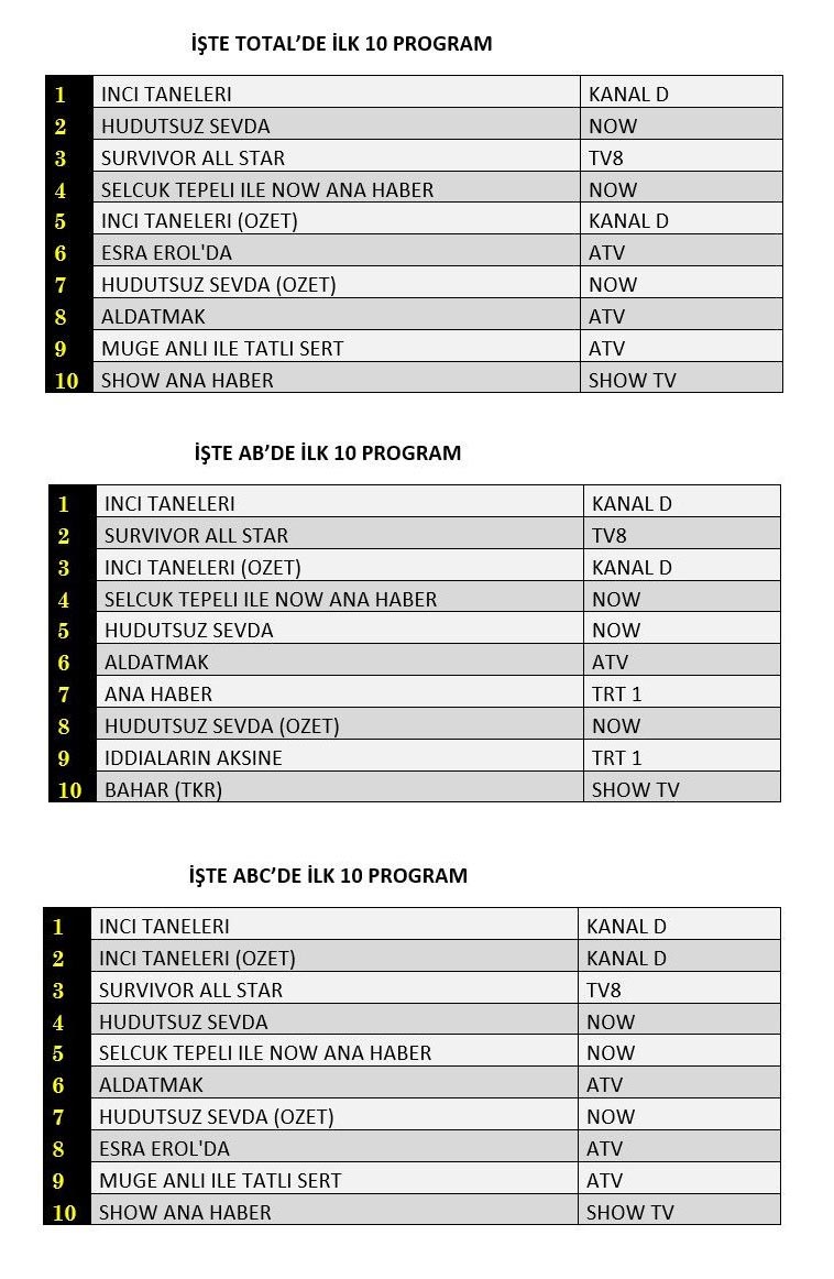 Total'de 1.sırada “İnci Taneleri”, 2. sırada “Hudutsuz Sevda”, 3.sırada “Survivor All Star” yer aldı.