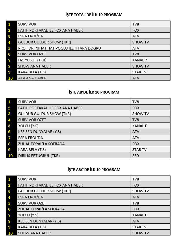 AB'de ise 1. sırada “Survivor”, 2. sırada “Fatih Portakal İle Fox Ana Haber”, 3. sırada Show TV’de yayınlanan “Güldür Güldür Show” yer aldı.