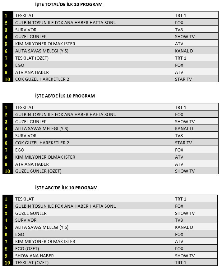 AB'de ise 1. sırada “Teşkilat”, 2. sırada “Gülbin Tosun İle Fox Ana Haber Hafta Sonu”, 3. sırada Show TV’de ekrana gelen “Güzel Günler” yer aldı.