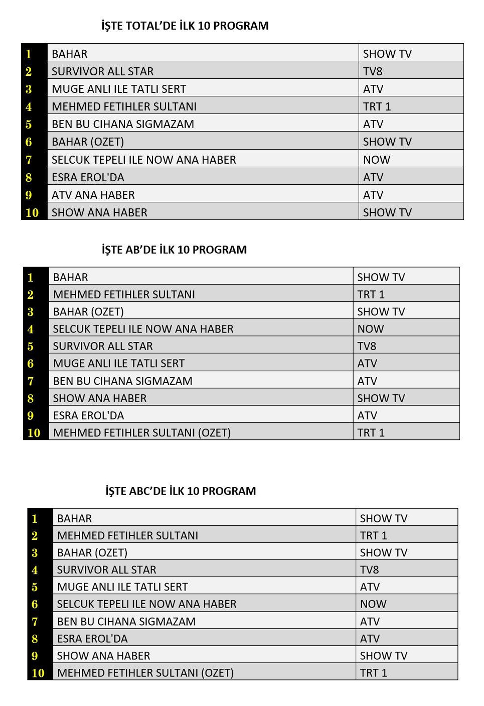 ABC'de ise 1.sırada “Bahar”, 2.sırada “Mehmed Fetihler Sultanı”, 3.sırada “Bahar” dizisinin özeti yer aldı.