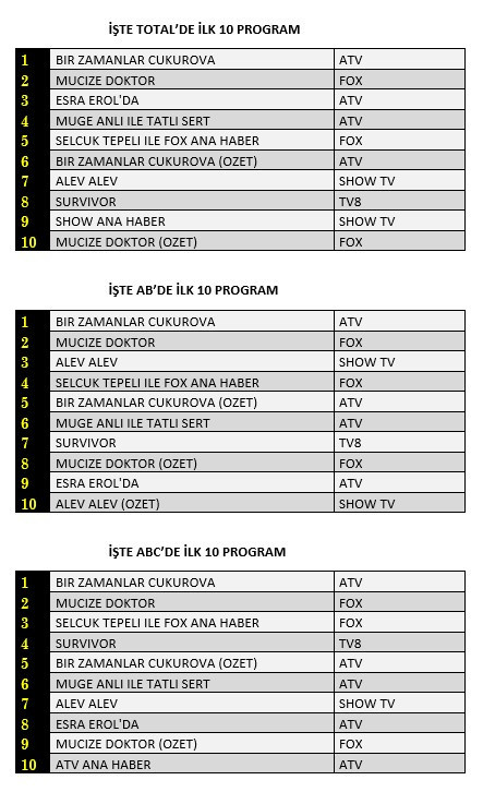 Total'de 1. sırada ATV’de ekrana gelen “Bir Zamanlar Çukurova”, 2. sırada Fox TV’de yayınlanan “Mucize Doktor”, 3.sırada ATV’de izleyiciyle buluşan “Esra Erol’da” programı yer aldı.