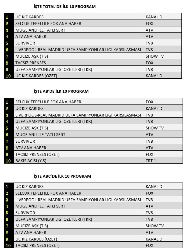 AB'de ise 1.sırada “Selçuk Tepeli İle Fox Ana Haber”, 2.sırada “Üç Kız Kardeş”, 3.sırada TV8’de yayınlanan “Liverpool-Real Madrid UEFA Şampiyonlar Ligi Karşılaşması” yer aldı.