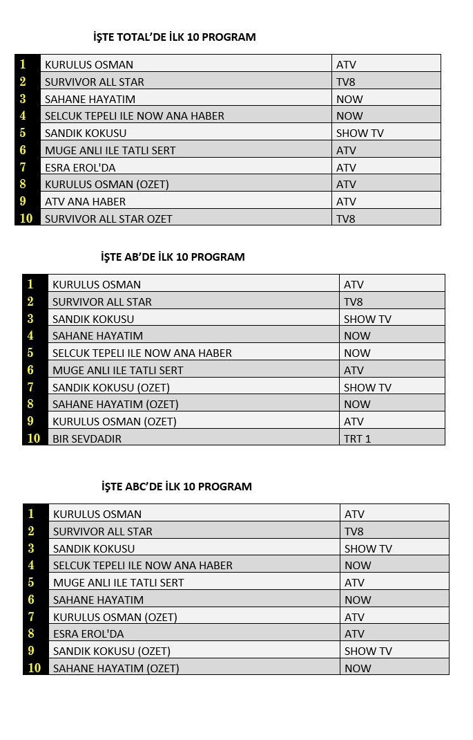 AB'de ise 1.sırada “Kuruluş Osman”, 2.sırada “Survivor All Star”, 3.sırada “Sandık Kokusu” yer aldı.