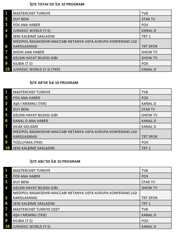 AB'de ise 1. sırada “Masterchef Türkiye”, 2. sırada “Fox Ana Haber” 3. sırada Kanal D’de yayınlanan “Aşk-ı Memnu” dizisinin tekrarı yer aldı.