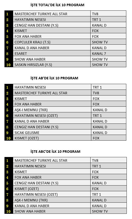 Total'de 1. sırada TV8’de izleyiciyle buluşan “Masterchef Türkiye All Star”, 2. sırada TRT1’de yayınlanan “Hayatımın Neşesi”, 3. sırada Kanal D’de yayınlanan yabancı sinema “Cengiz Han Destanı” yer aldı.