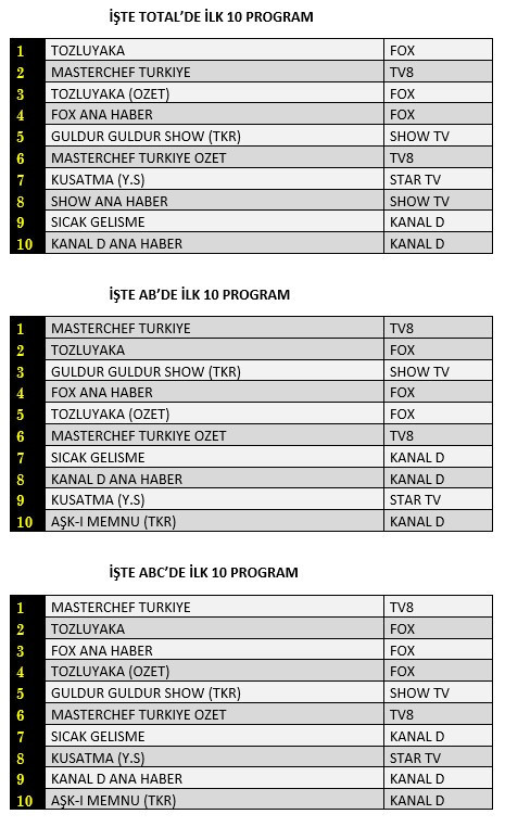 Total'de 1. sırada Fox TV’de izleyiciyle buluşan “Tozluyaka”, 2. sırada TV8’de yayınlanan “Masterchef Türkiye”, 3. sırada “Tozluyaka”nın özeti yer aldı.