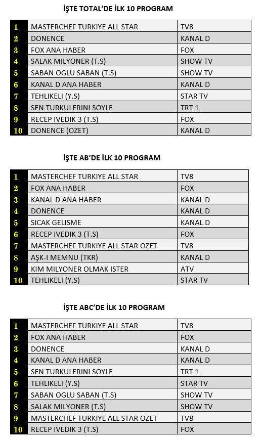 AB'de ise 1.sırada “Masterchef Türkiye All Star”, 2.sırada “Fox Ana Haber”, 3.sırada “Kanal D Ana Haber” yer aldı.