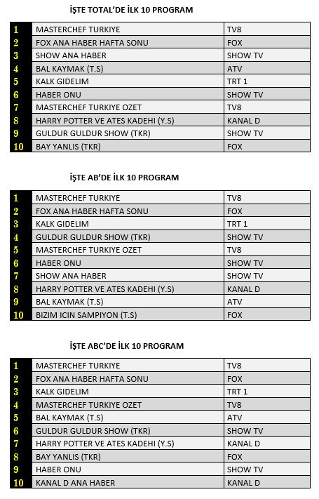 AB'de ise 1. sırada “Mastercheff Türkiye”, 2. sırada “Fox Ana Haber Hafta Sonu”, 3. sırada TRT1’de yayınlanan “Kalk Gidelim” yer aldı.