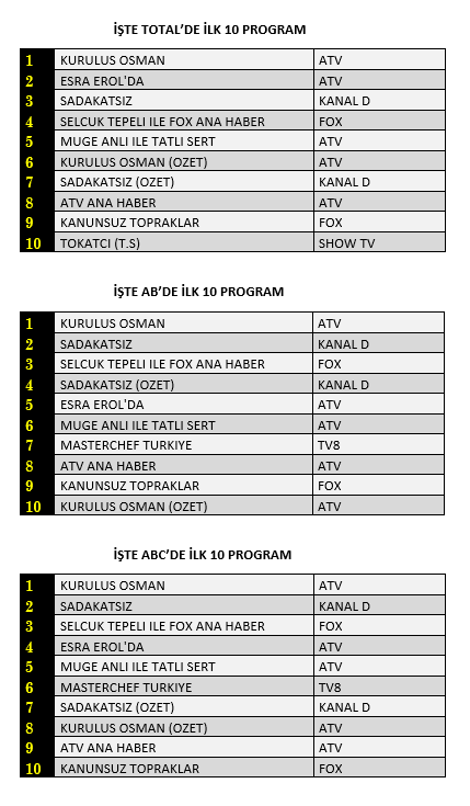 AB'de ise 1. sırada “Kuruluş Osman”, 2. sırada “Sadakatsiz” 3. sırada “Selçuk Tepeli İle Fox Ana Haber” yer aldı.