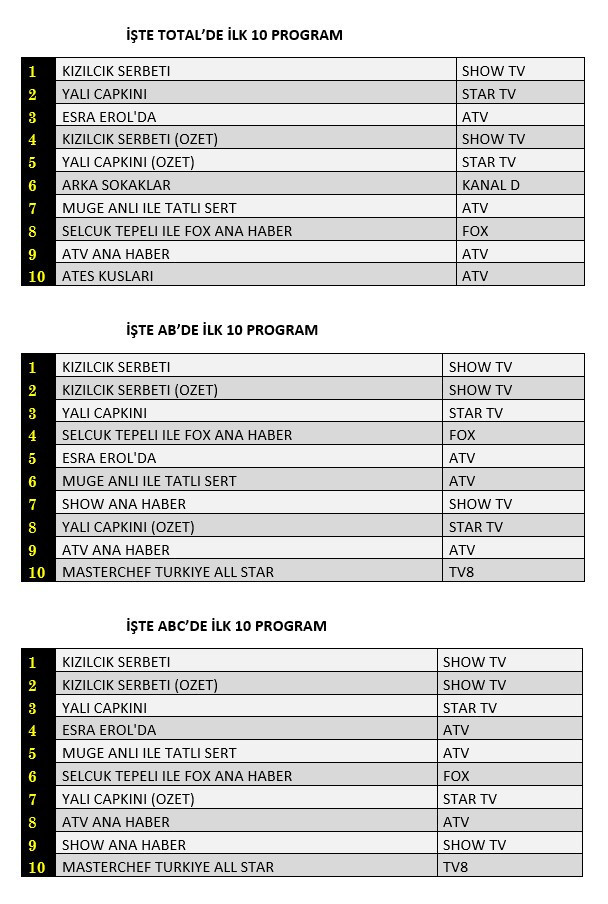 Total'de 1. sırada Show TV’de izleyiciyle buluşan “Kızılcık Şerbeti”, 2. sırada Star TV’de yayınlanan “Yalı Çapkını”, 3. sırada Atv’de ekrana gelen “Esra Erol’da” yer aldı.