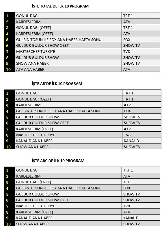 Total'de 1.sırada TRT1’de izleyiciyle buluşan “Gönül Dağı”, 2. sırada Atv’de ekrana gelen “Kardeşlerim”, 3.sırada “Gönül Dağı” dizisinin özeti yer aldı.
