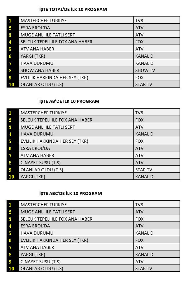 AB'de ise 1. sırada “Masterchef Türkiye”, 2. sırada “Selçuk Tepeli İle Fox Ana Haber” 3. sırada “Müge Anlı İle Tatlı Sert” yer aldı.