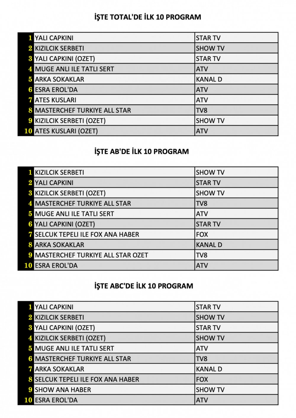 Total’de 1. sırada Star TV’de izleyici ile buluşan “Yalı Çapkını”, 2. sırada Show TV’de ekranlara gelen “Kızılcık Şerbeti”, 3. sırada “Yalı Çapkını” özet bölümü yer aldı.