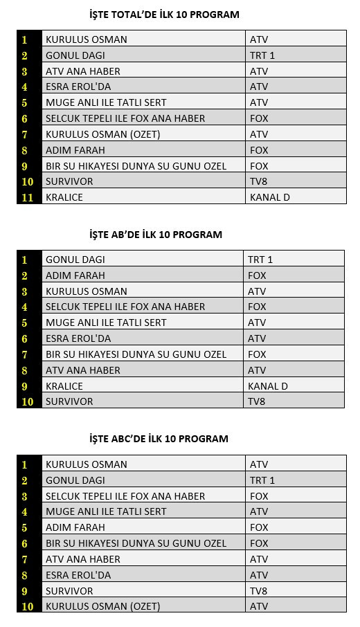 Total'de 1. sırada Atv’de izleyiciyle buluşan “Kuruluş Osman”, 2. sırada TRT1’de ekrana gelen “Gönül Dağı”, 3. sırada “Atv Ana Haber” yer aldı.