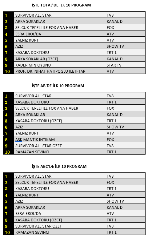 AB'de ise 1. sırada “Survivor All Star”, 2. sırada TRT1’de yayınlanan “Kasaba Doktoru” 3. sırada “Selçuk Tepeli İle Fox Ana Haber” yer aldı.