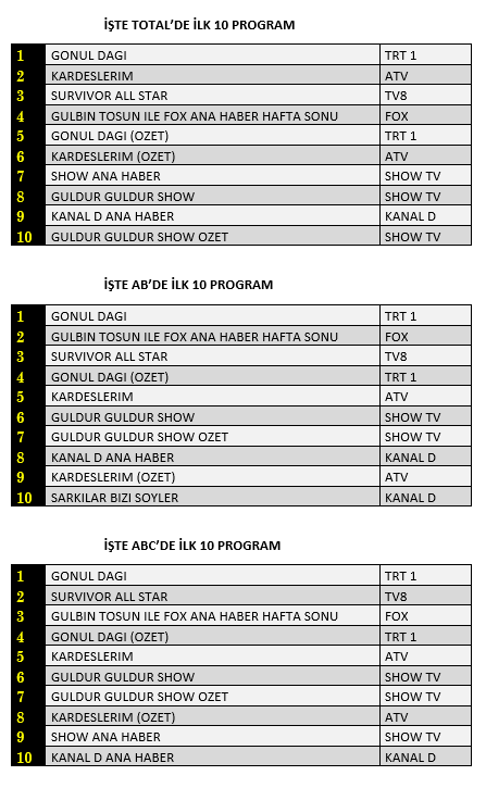 Total'de 1.sırada TRT1’de yayınlanan “Gönül Dağı” 2. sırada ATV’de izleyiciyle buluşan “Kardeşlerim”, 3.sırada TV8’de ekrana gelen “Survivor All Star” yer aldı.