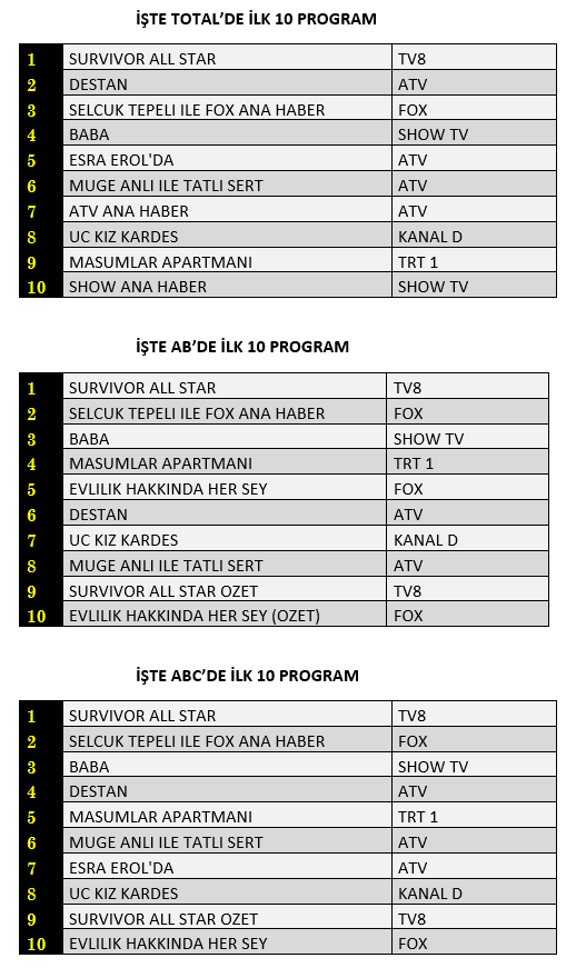Total'de 1. sırada TV8’de ekrana gelen “Survivor All Star” 2. sırada ATV’de yayınlanan “Destan”, 3. sırada “Selçuk Tepeli İle Fox Ana Haber” yer aldı.