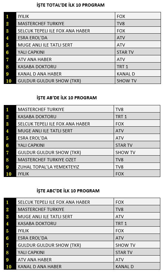AB'de ise 1. sırada “Masterchef Türkiye”, 2. sırada TRT1’de yayınlanan “Kasaba Doktoru” 3. sırada “Selçuk Tepeli İle Fox Ana Haber” yer aldı.