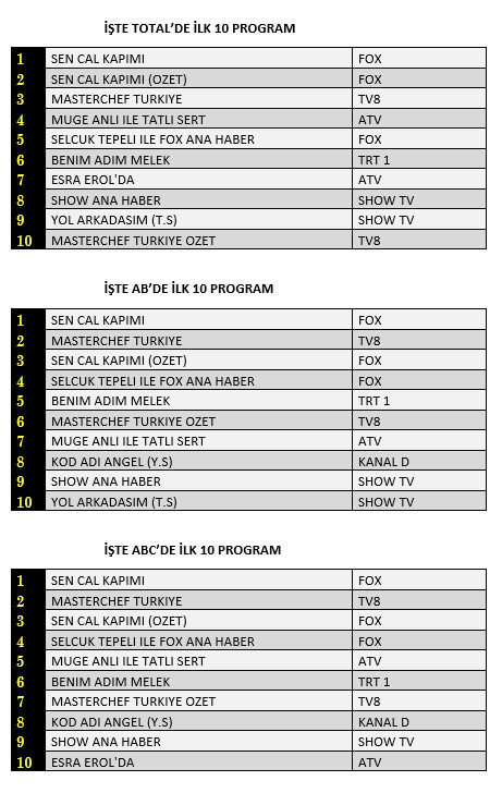 AB'de ise 1. sırada “Sen Çal Kapımı”, 2. sırada “Mastercheff Türkiye”, 3. sırada “Sen Çal Kapımı” dizisinin özeti yer aldı.