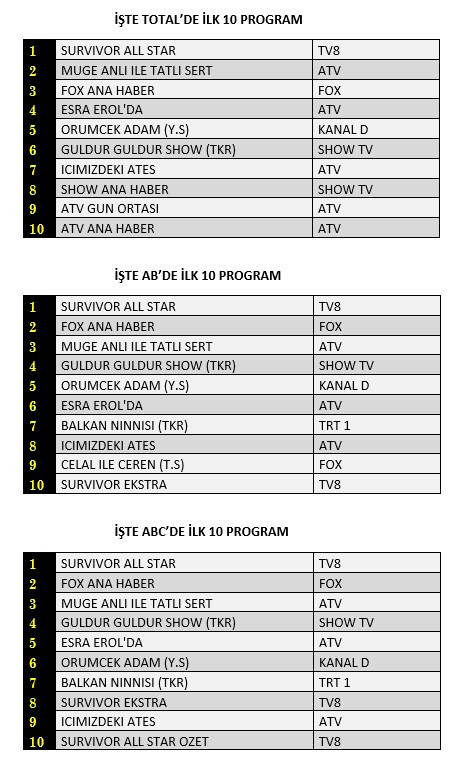 Total'de 1. sırada TV8’de izleyiciyle buluşan “Survivor All Star”, 2. sırada ATV’de ekrana gelen “Müge Anlı İle Tatlı Sert”, 3. sırada "Fox Ana Haber” yer aldı.