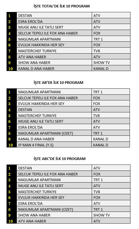 AB'de ise 1. sırada TRT1’de yayınlanan “Masumlar Apartmanı”, 2. sırada “Selçuk Tepeli İle Fox Ana Haber” 3. sırada Fox TV’de yayınlanan “Evlilik Hakkında Her Şey”, 4. sırada ATV’de ilk bölümü ekrana gelen ‘Destan’ dizisi yer aldı.