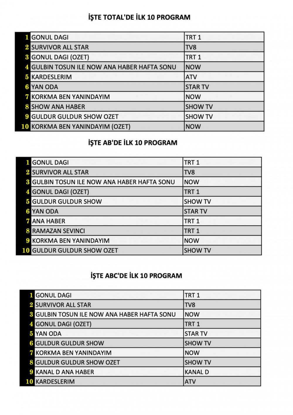 ABC’de 1. sırada “Gönül Dağı”, 2. sırada “Survivor All Star”, 3. sırada ise “Gülbin Tosun ile Now Ana Haber Hafta Sonu” yer aldı.